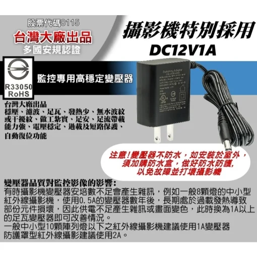 🔥附台灣大廠安規認證監控專用DC12V穩壓足瓦變壓器