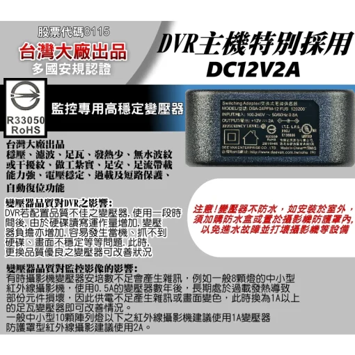 DVR若配置品質不佳之變壓器,使用一段時間後,由於硬碟讀寫運作量增加,變壓器負擔亦增加,容易發生當機、抓不到硬碟、畫面不穩定等問題,此時,更換品質優良之變壓器可改善情況。